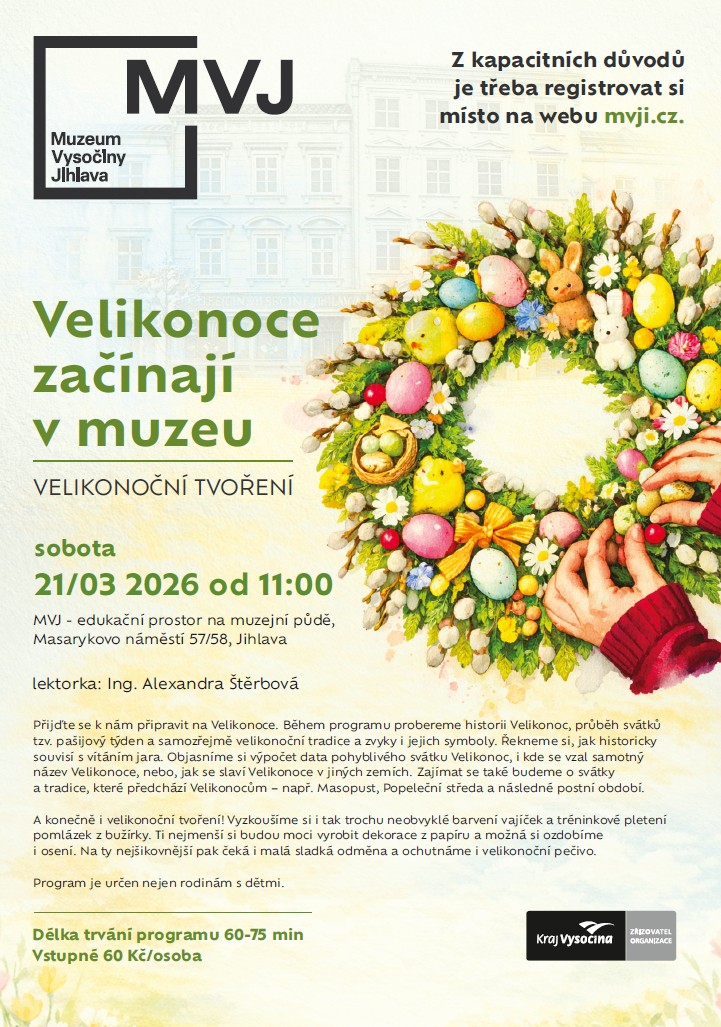 Přijďte se k nám připravit na Velikonoce. Během programu probereme historii Velikonoc, průběh svátků tzv. pašijový týden a samozřejmě velikonoční tradice a zvyky i jejich symboly. Řekneme si, jak historicky souvisí s vítáním jara. Objasníme si výpočet data pohyblivého svátku Velikonoc, i kde se vzal samotný název Velikonoce, nebo, jak se slaví Velikonoce v jiných zemích. Zajímat se také budeme o svátky a tradice, které předchází Velikonocům – např. Masopust, Popeleční středa a následné postní období.
