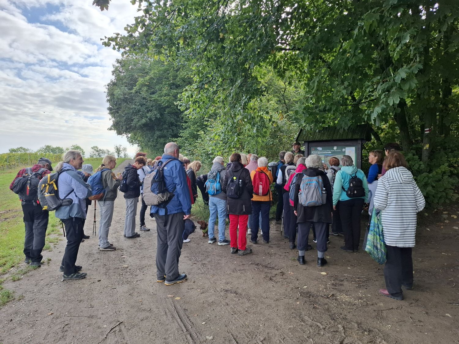 Exkurzi jsme zahájili ráno v Dolních Věstonicích (rodišti a nalezišti známé Venuše). Prošli jsme obcí a výše ležícími vinohrady a u vstupu do rozsáhlých lesních porostů masivu Děvína jsme se u informační tabule setkali s RNDr Jiřím Matuškou, dlouholetým pracovníkem Správy Chráněné krajinné oblasti Pálava. S Jirkou se znám nejméně třicet let a tak znám jeho skvělé řečnické schopnosti, vysokou informovanost a znalosti a také jeho smysl pro humor. Proto jsem jej požádal o krátké setkání s naší výpravou a seznámení s Pálavou a činností státní ochrany přírody v tomto regionu. Jirka to vzal, jak je mu zvykem, po svém a tak nás provázel po většinu celé exkurze a během řady zastavení nám podal spoustu informací i veselých příhod ze života a odpověděl na desítky otázek zvědavých účastníků exkurze.