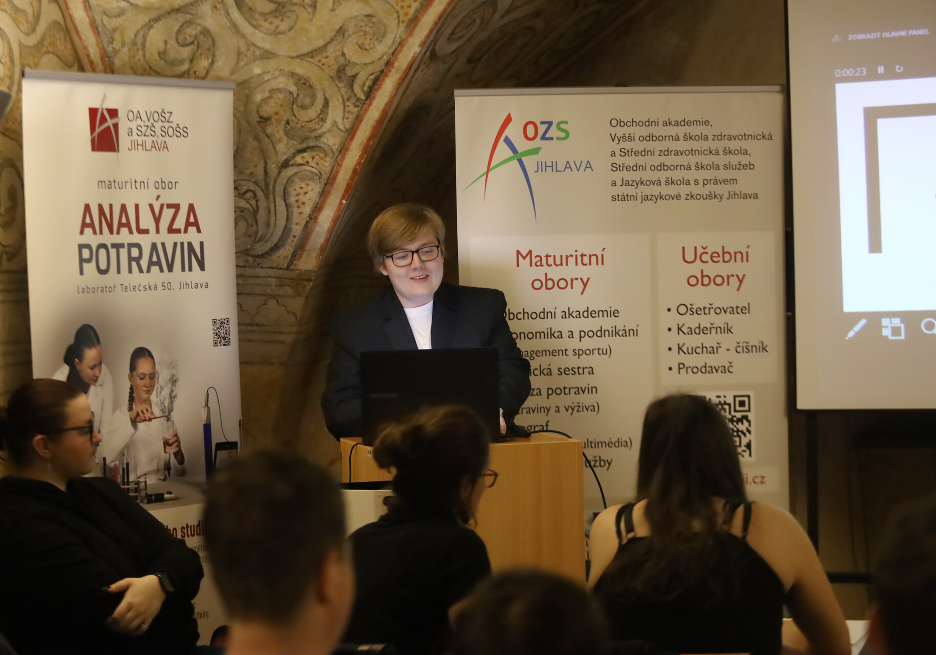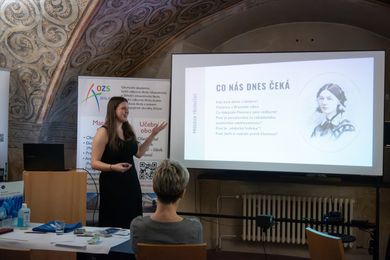 Své projekty představili studenti jihlavské OZS, kteří se věnovali osobnostem a tématům spojeným s vědou a jejím přínosem pro společnost. Zazněly příspěvky například o Angelině Hesse, Kateřině Sam, Marii Montessori či Florence Nightingale, ale také aktuální téma Plasty v našich rukách, které otevřelo diskusi o odpovědnosti a dopadech nejen vědy na každodenní život.