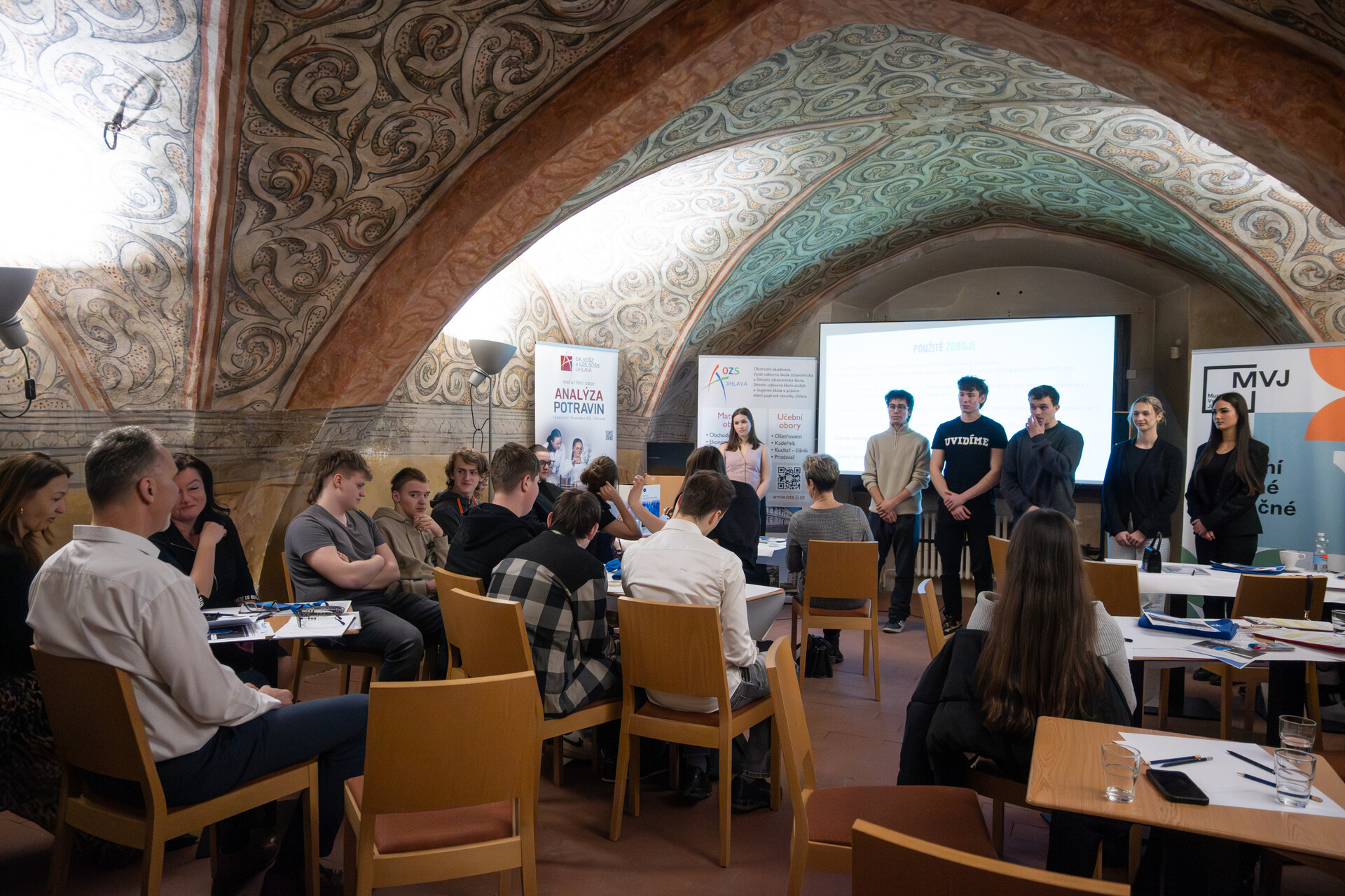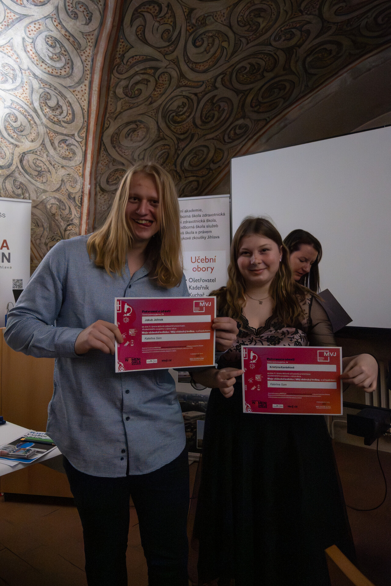 Své projekty představili studenti jihlavské OZS, kteří se věnovali osobnostem a tématům spojeným s vědou a jejím přínosem pro společnost. Zazněly příspěvky například o Angelině Hesse, Kateřině Sam, Marii Montessori či Florence Nightingale, ale také aktuální téma Plasty v našich rukách, které otevřelo diskusi o odpovědnosti a dopadech nejen vědy na každodenní život.