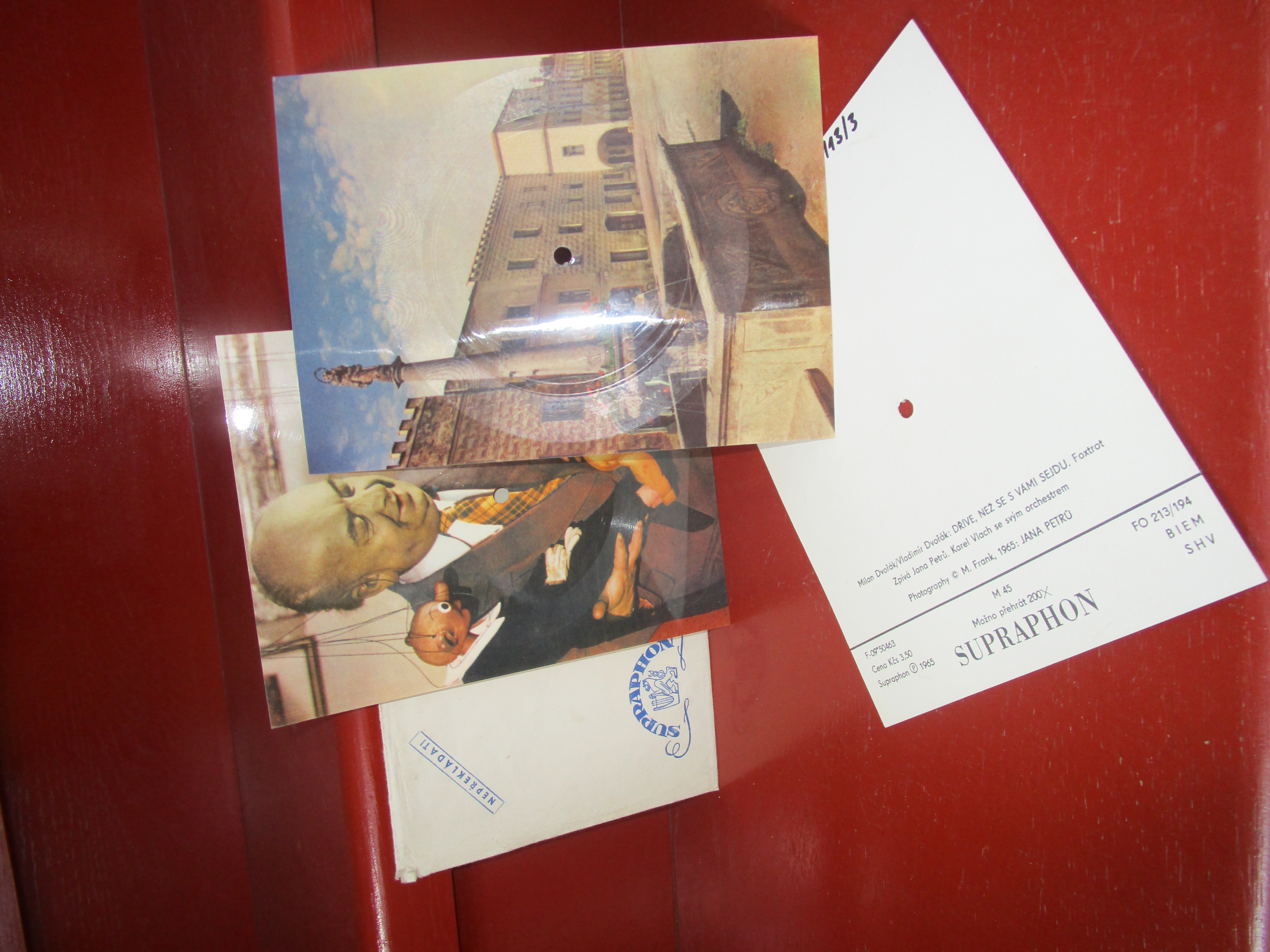 Při vyklízení jednoho třešťského bytu jsme do muzea dostali i tři gramofonové desky, které jejich vydavatel Supraphon řadí mezi tzv. speciality. Jedná se o záznamy např. na pohlednice, či tenké fólie, které se vkládaly jako příloha do časopisů. S nápadem jako první přišli Angličané. Supraphon v 60. letech vyrobil několik sad pohlednic opatřených zvukovým záznamem ve speciálních obálkách s logem firmy jako příloha časopisů Ahoj na sobotu a ABC. Foxtrot Jany Petrů, Spejbl a doba kamenná a Slavonická polka jsou názvy tři hrajících pohlednic uložených nedávno do našeho sbírkového fondu.